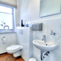 - Verflieste Ablagen hinter Waschtisch und WC